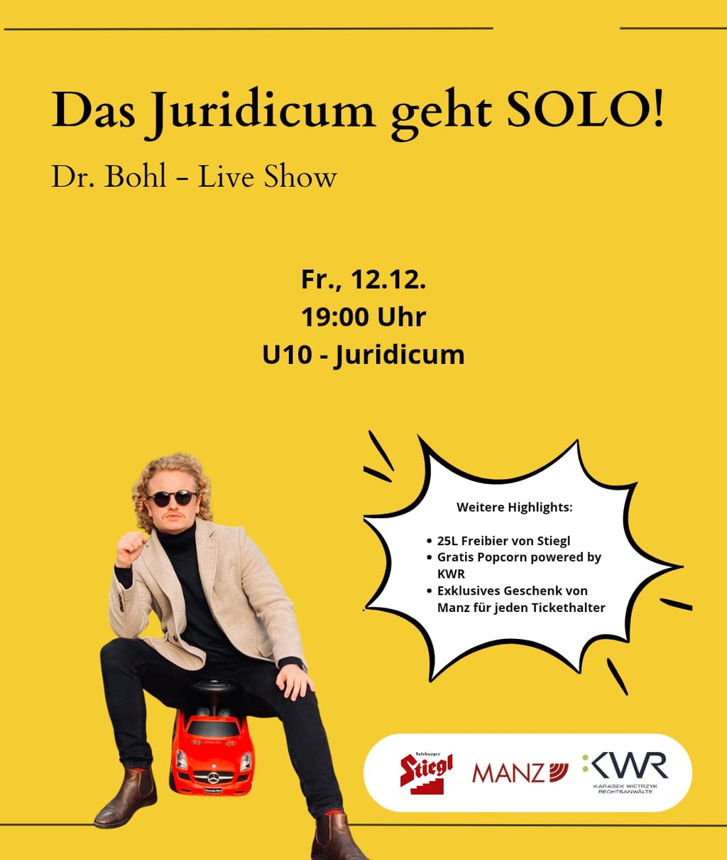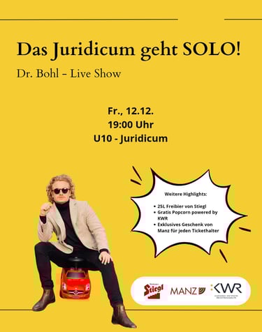 Dr.Bohl kommt (zurück) ans Juridicum! Freut euch auf einen Abend voller Humor in einem Gebäude, das nicht unbedingt dafür bekannt ist.